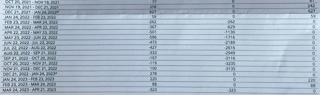- The reset occurred in February, when we obtained that month’s bill. It illustrates that we received a sizable credit! See Figure 1, and note the interval at the end of 2022 – minus consumption captured on the bill spanning Dec 21 thru Jan 24.
